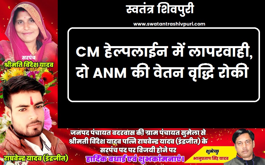 शिवपुरी। मुख्य चिकित्सा एवं स्वास्थ्य अधिकारी डॉ.पवन जैन ने जननी सुरक्षा योजना में भुगतान लंबित होने के कारण सीएम हेल्पलाइन में 400 दिवस से अधिक शिकायत लंबित होने पर पिछोर विकासखंड के चिन्नौदी ग्राम की एएनएम तथा प्राथमिक स्वास्थ्य केन्द्र खोड की एएनएम की दो-दो वेतन वृद्धि रोकने की कार्यवाही असंचयी प्रभाव से की गई है।