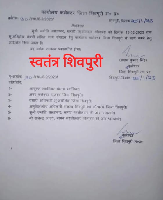 शिवपुरी। आज स्वतंत्र शिवपुरी की खबर का फिर बड़ा असर हुआ है। बीते रोज कोलारस तहसीलदार ज्योति लक्षकार द्वारा शोसल साइड पर एक पोस्ट डालने के बाद मचे बबाल के बाद आज कलेक्टर ने ज्योति लक्षकार को हटा दिया है। उन्हें कोलारस से हटाकर कलेक्टर कार्यालय में अटैच किया गया है।