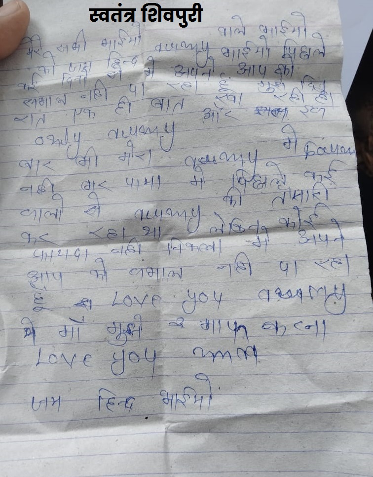 शिवपुरी। खबर शहर के फिजीकल थाना क्षेत्र के करौंदी कॉलोनी से आ रही है। जहां एक 22 साल के युवक ने ससुाईड नोट में LOVE YOU ARMY, मां मुझे माफ करना, जय हिंद भाइयों…। लिखा और अग्निवीर के पेपर में फेल हुए एक 22 साल के युवक ने आम के पेड पर फांसी लगाकर सुसाईड कर लिया। इस मामले में पुलिस को युवक की जेब से एक सुसाईड नोट भी मिला है।
