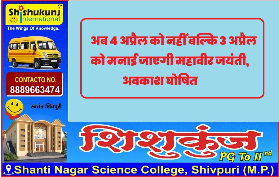Shivpuri अब 4 अप्रैल को नहीं बल्कि 3 अप्रैल को मनाई जाएगी महावीर जयंती, अवकाश घोषित Posted on मार्च 28, 2023मार्च 28, 2023 by swatantra shivpuri शिवपुरी। राज्य शासन ने महावीर जयंती के उपलक्ष्य में 3 अप्रैल को प्रदेश में सामान्य एवं सार्वजनिक अवकाश घोषित किया है। महावीर जयंती के लिये पूर्व में घोषित 4 अप्रैल के अवकाश को निरस्त कर दिया है। Advertisement