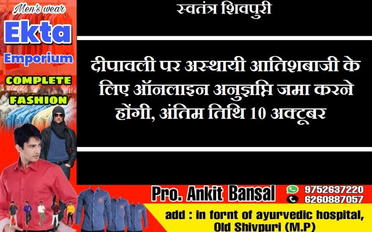 शिवपुरी। जिले में अस्थायी आतिशबाजी अनुज्ञप्ति हेतु ऑनलाइन आवेदन पत्र प्रस्तुत करने की अंतिम तिथि 10 अक्टूबर नियत की गई है।