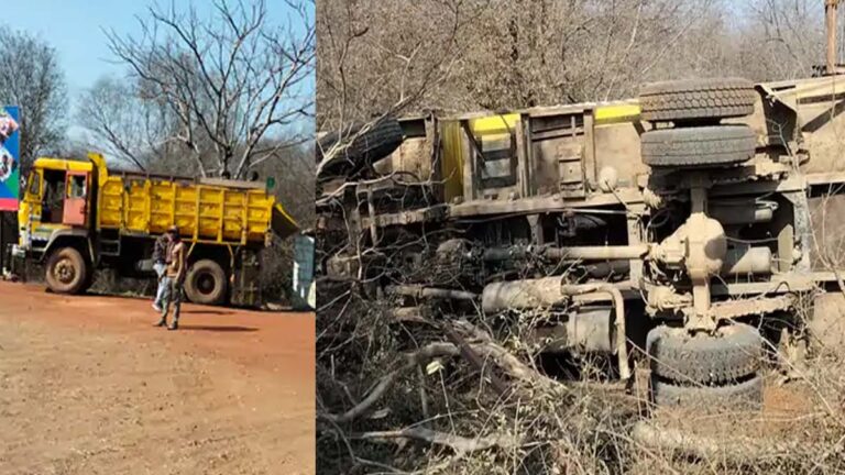 ड्रायवर रॉयल्टी चैक कराने उतर गया,बिना ड्रायवर के 100 मीटर दौड गया डंपर,आगे जाकर पलट गया